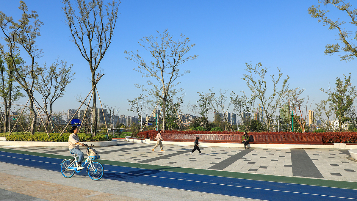 设计以生态绿地为基底,以贯穿场地的五线谱慢行系统为骨架,结合周边地块功能、市政道路以及景观空间韵律,安排运动天地、蝶趣童飞、工业遗址公园、沿江观景台、火炬广场等多个不同功能的节点。