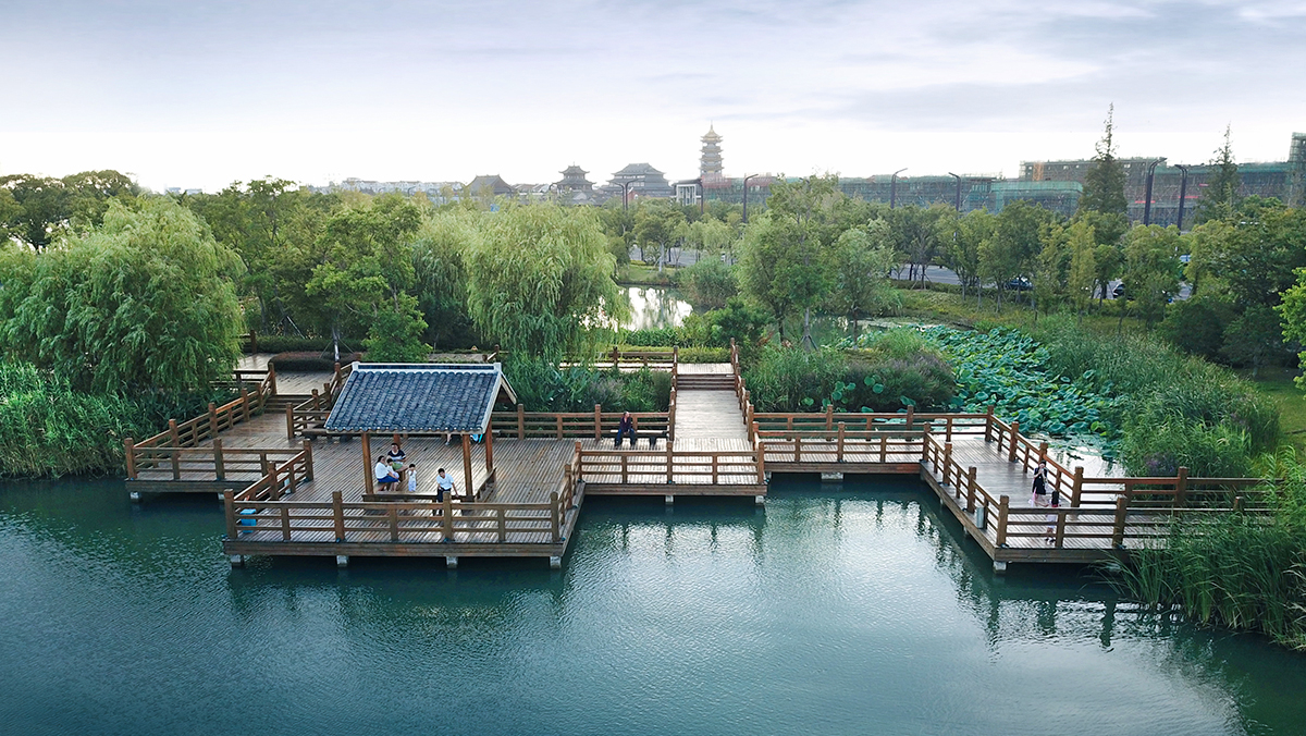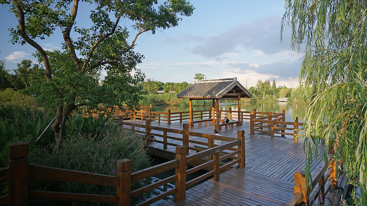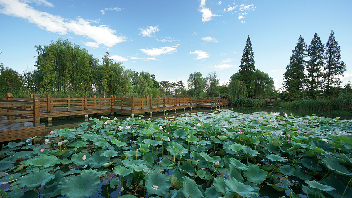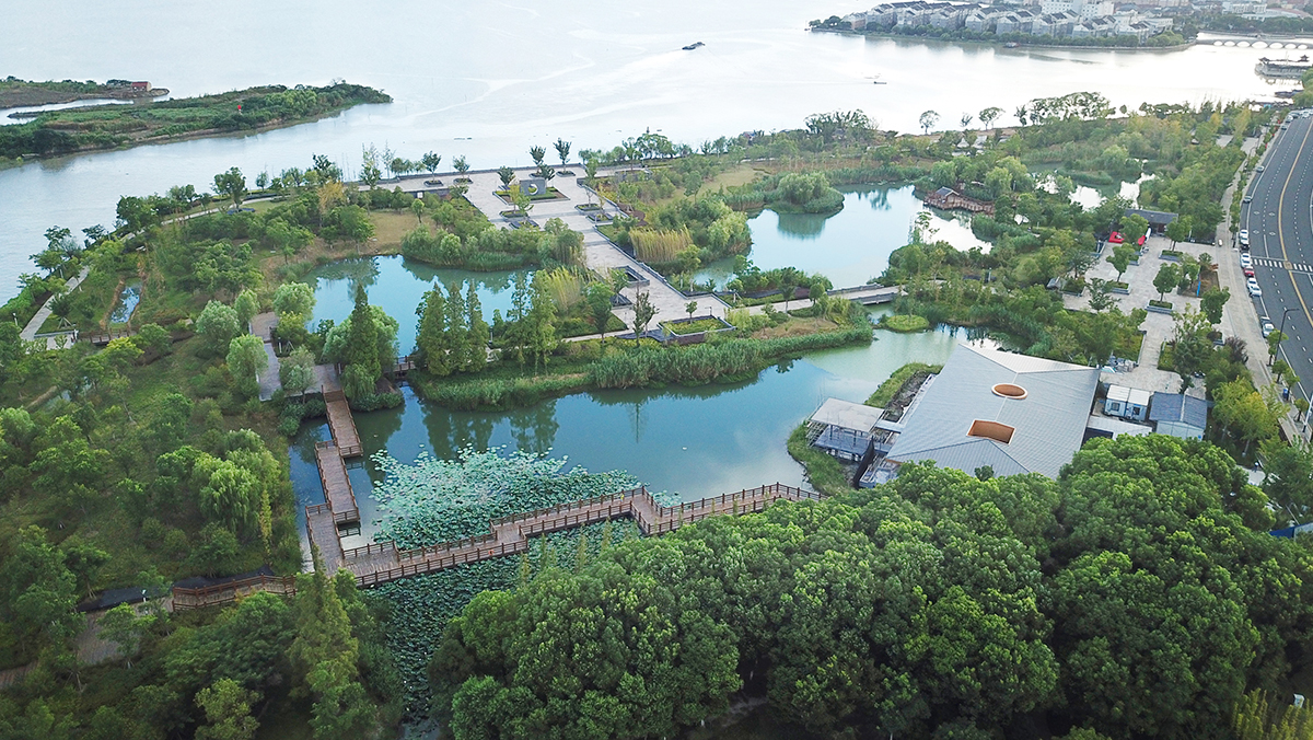 莺脰湖地处水网纵横的苏州市吴江区平望镇,是平望的母亲湖,自古便以烟波浩渺,芦苇茂盛,白鹭翻飞,征帆渔歌的形象为人称颂。生态水景园位于莺脰湖北岸,总面积约 15 公顷,是吴江区“1058 工程”中重要的生态文明工程。