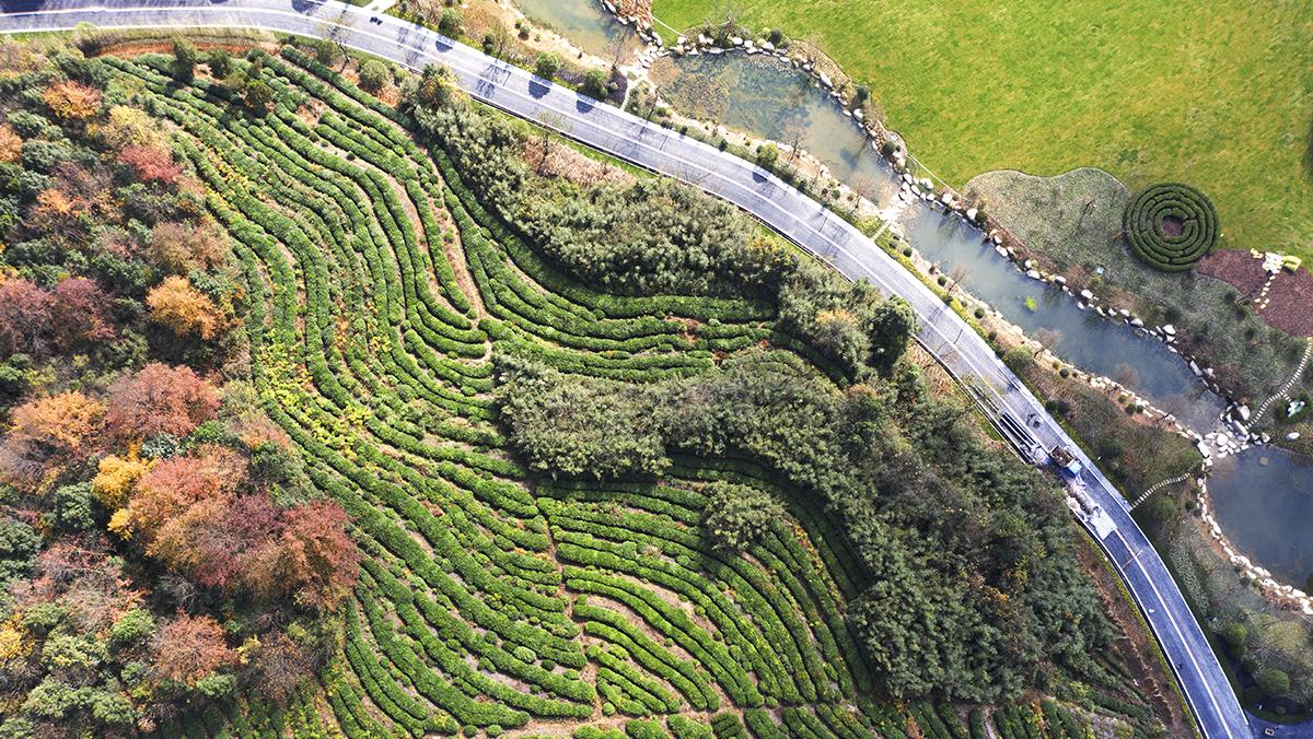 场地内地形地貌区域划分明显,北侧与东侧为山体,高差变化较大,将外部交通主干道阻隔,交通可达性差;南侧西侧为平坦荒地。场地外围建筑以民居、厂房为主,风貌较差。现状山 - 水 - 林 - 田 - 茶自然资源丰富,现有山沟绕荒地而过,上游无污染源水质较好。