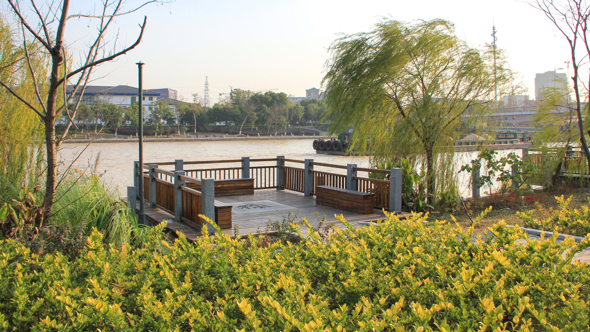 设计根据场地特征,将景观带划分为健身花园、绿色长廊、仁皇记忆、河港风光、休闲乐园五个区段。同时结合周边环境,整合场地的景观资源,通过滨水游步道串连起文化广场、休闲设施、活动草坪、运动场地等一系列服务于周边居民的丰富主题空间,形成与周边公园、景观带密切关联的城市滨水开放空间,成为城市公园体系中不可或缺的一部分。