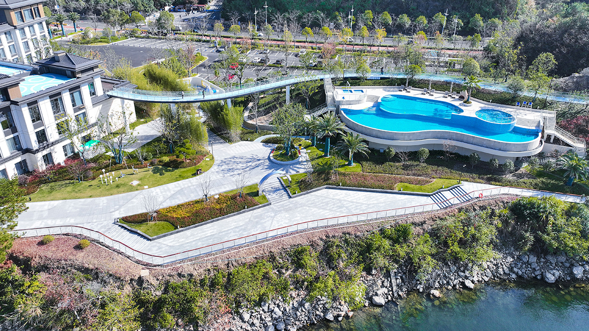 项目以得天独厚的自然条件和别具一格的室外景观设施彰显度假风情。迎宾景墙、无边泳池、曲形空中栈道、观景挑台、竹林大道、枫之月网红打卡点、户外儿童乐园、户外咖吧等,作为游客休闲打卡、放松休憩之所,纵享湖畔生活新体验。