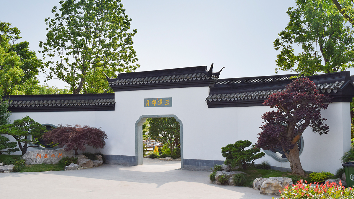设计在主轴线上设置了入口小广场、景墙、平桥、我心相印亭、亲水平台、内湖、曲岸花堤、三潭石塔等一系列景观元素,并利用传统园林障景、框景、借景等各种手法,打造步移景异的景观效果。北部的叠石山坡为全园制高点,设有开网亭,可俯瞰全园。南部次入口附近设有醉月楼,用于文化展示。园内还穿插了“鱼沼秋蓉”、“竹径通幽”、“风月无边”、“卍”字亭等景观,全方位展示“三潭印月”的景观。