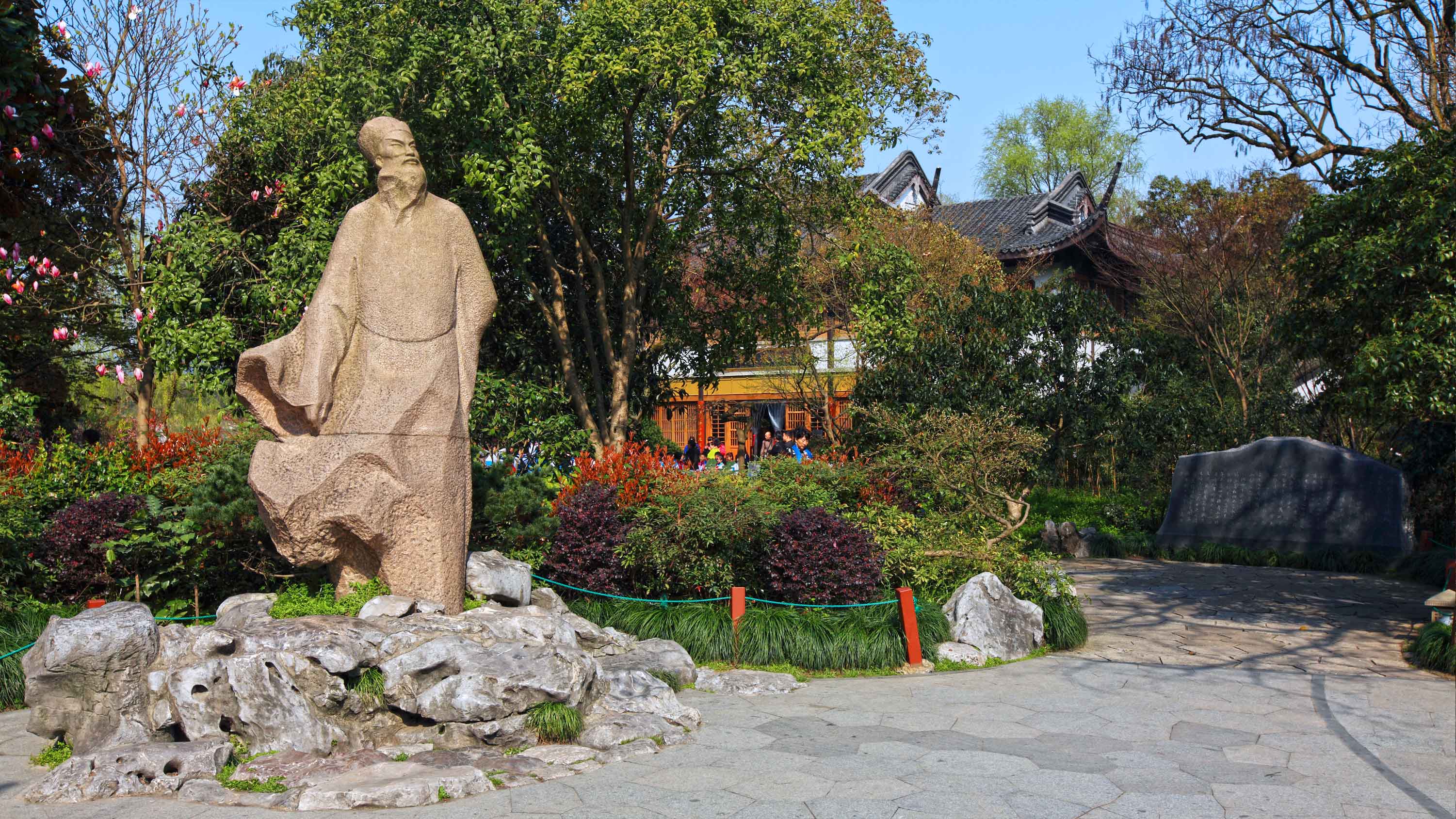 纪念馆总体布置自由,因场地所限,入口斜向设置,中心小广场树东坡石像,轴线在此巧妙转折。主体建筑面南而立,空间开敞,画廊和酌月轩成曲尺形布局,围合成内聚的庭院空间,小中见大。建筑单体体量不大,但屋面丰富,自由轻巧,既符合苏东坡为官身份,又体现其亲民的性格。