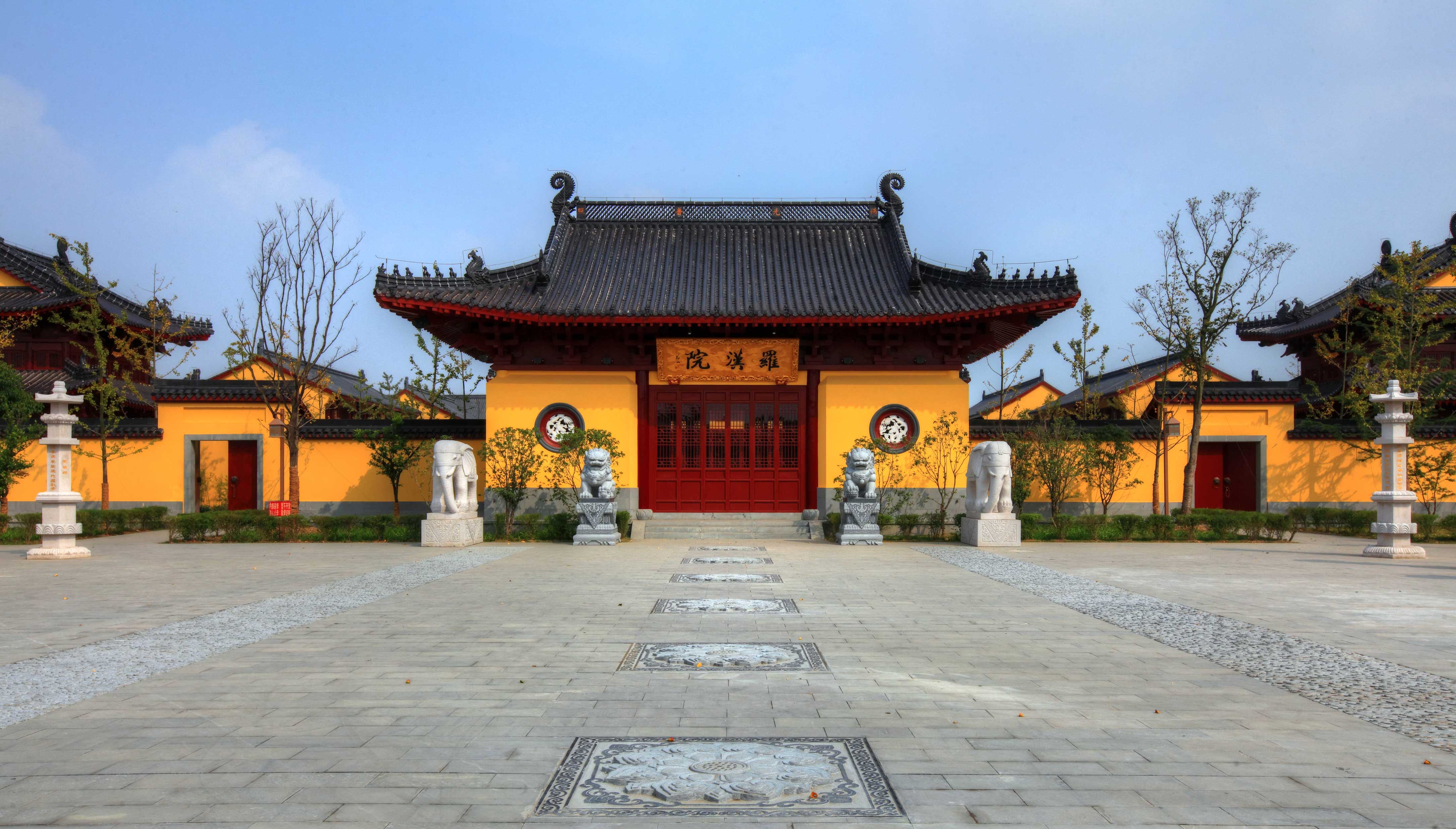 建湖城南双湖公园罗汉院布局于双湖公园西片东面的佛教文化区,采用庙宇的传统格式,黄墙黑瓦,由南及北主轴线上,分设石作照壁、山门、天王殿、钟、鼓楼、大殿、藏经楼等。两侧设以二层为主的东、西厢房,配套香客吃、住等必要的生活设施及僧寮、方丈室等;塑造出完整空间序列的同时,注重其外环境的配合组织,形成本区块幽、静、禅的特定空间氛围。