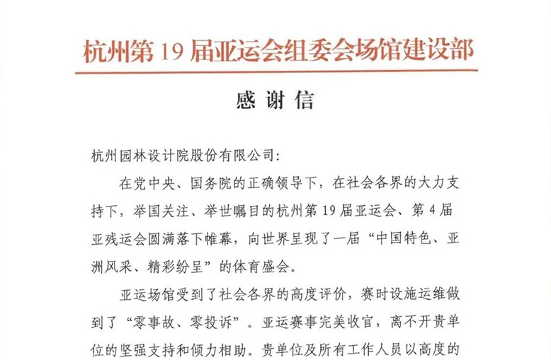 10月30日,我公司收到了杭州第19届亚运会组委会场馆建设部发来的感谢信。信中高度肯定了我公司在亚运会期间给予的坚强支持和倾力相助,并对公司及所有工作人员表示衷心的感谢和诚挚的敬意。