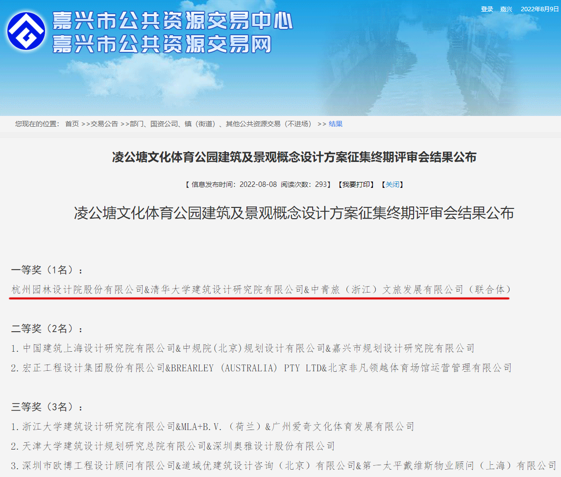 8月8日,嘉兴市公共资源交易中心发布了凌公塘文化体育公园建筑及景观概念设计方案征集终期评审会结果,由我司与清华大学建筑设计研究院有限公司、中青旅(浙江)文旅发展有限公司组成的联合体荣获一等奖。