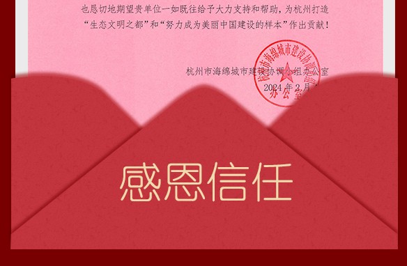 2月4日,杭州市海绵城市建设协调小组办公室向我公司发来感谢信。信中对我公司的辛勤付出和专业支持深表感谢,高度肯定了我公司团队在海绵城市建设工作中,积极献计献策、参加现场指导、会议协商、政策指导、方案会审等活动。